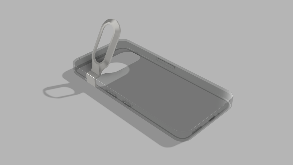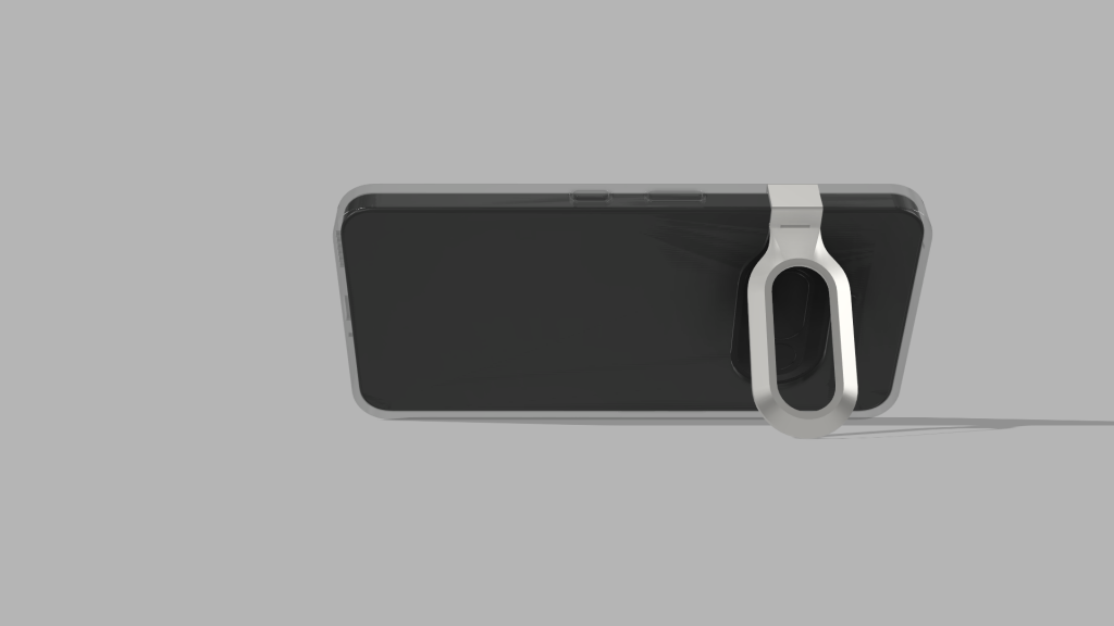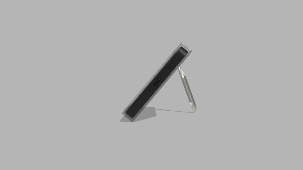 Das Gelenk wird als fester Bestandteil der Hülle mit in das Silikon eingebunden. Durch die Wahl von Aluminium wird ein fester Stand mit minimalem zusätzlichen Gewicht garantiert. Weiter bricht das Gelenk die sonst uniforme Wirkung des Silikons sowohl auf der Rückseite, als auch das das Aussehen der rechten Seite des Smartphones.